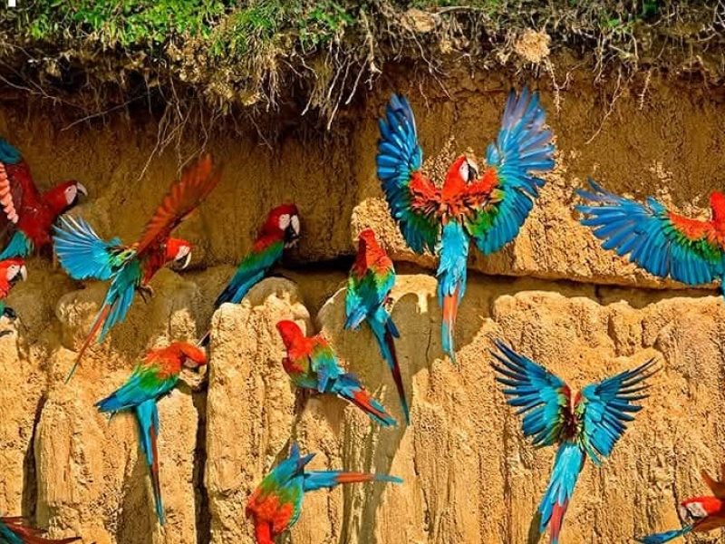 This rare natural event is a highlight of the Tambopata region and offers an unforgettable glimpse into the rainforest’s wildlife in its most authentic setting. You may spot up to three species of macaws, all in flight or perched along the clay cliffs.